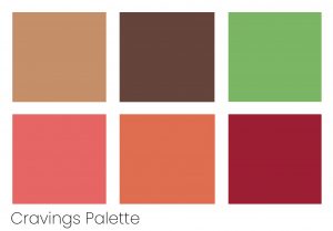 ‘Cravings’, the first palette, is inspired by food. It is a variety of rich reds and purples, flamingo orange, and warm browns.